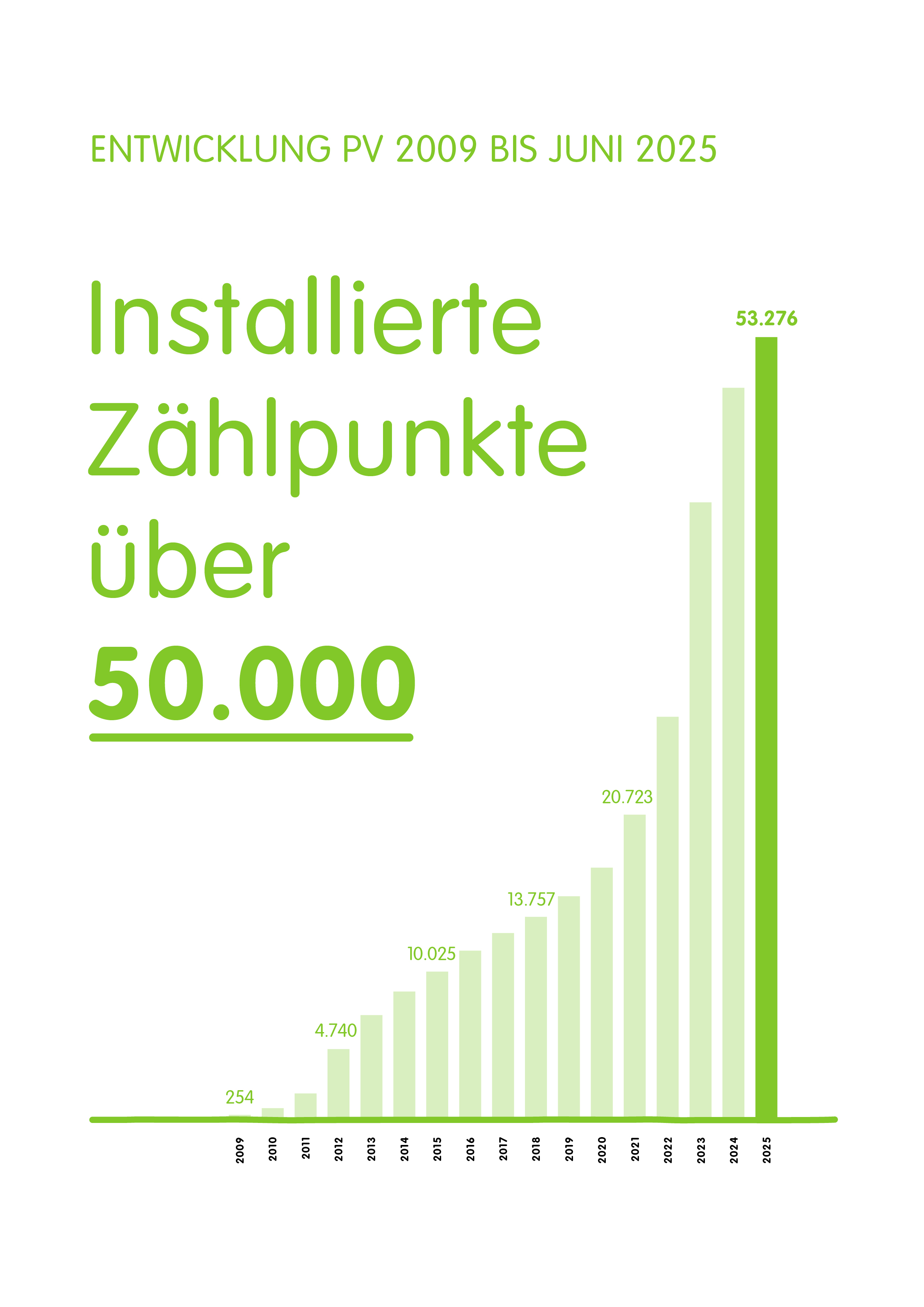 Im Netzgebiet der Energienetze Steiermark ist die direkt installierte Photovoltaik-Leistung bis zum Sommer 2025 erstmalig über 1.000 Megawatt gestiegen. Auch die Zahl der Photovoltaik-Zählpunkte erreicht mit über 53.000 einen neuen Höchststand. Zum Vergleich: 2009 waren es gerade einmal 254.